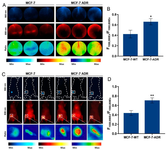 (A) NIR-II imaging of MCF-7-WT and MCF-7-ADR cells after incubation with LnNP@ZIF8-DOX. Min: ratio = 0; Max: ratio = 1. (B) The corresponding ratiometric F1550,980Ex/F1060,808Ex value of (A). (C) NIR-II imaging of MCF-7-WT and MCF-7-ADR orthotopic tumor mice treated with LnNP@ZIF8-DOX under 808 and 980 nm laser irradiation and high magnification NIR-II ratio diagrams of tumor sites treated with nanoprobes. (D) The corresponding ratiometric F1550,980Ex/F1060,808Ex value of the tumor site ratio diagrams. All experiments were performed independently at least three times. * p < 0.05 and ** p < 0.01, were determined by one-way ANOVA with Student’s t tests (two-tailed).