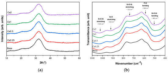 (a) XRD diffractogram and (b) FTIR spectra of Bioglass 45S5 with several concentrations of cerium (0, 0.25, 0.5, 1, and 2 mol%).
