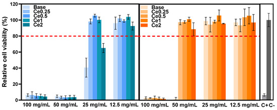 Furthermore, the cytotoxicity of the extracts decreased when the materials were subjected to a passivation process (right side graph). The cell viability results for the passivated extracts show non-cytotoxicity for the samples with CeO2 at extract concentrations of 50 mg/mL, and the base also does not show cytotoxicity at 25 mg/mL. Comparing the results of passivated and non-passivated extracts, it is important to consider that cytotoxicity is associated with an increase in local pH due to a high rate of ion-exchange reactions that occur when the material interacts with the cell culture medium during the first 24 h [27]. When the bioactive glass comes into contact with the cell medium, there is a breakdown of the Si-O-Si bonds, and the release of soluble silica into the solution in the form of Si(OH)4 occurs. The rate of dissolution increases the pH of the surrounding environment, which affects metabolism and cellular function and may even influence gene expression. Furthermore, osteoblasts are extremely sensitive to extracellular pH in in vitro tests, increasing the efficacy of osteoblastic activity and cell proliferation at near-neutral pH (7.0–7.6), with downregulation at pH 7.8. Moreover, the function of osteoclasts is indispensable in the initial phase of bone regeneration, promoted by acidic environments. However, this effect is not visible in the in vivo environment due to the existence of dynamics that allow the organism to regulate and balance the pH. Thus, in vitro studies to assess cell viability have been defined in order to limit pH changes that are not present in vivo [30].
