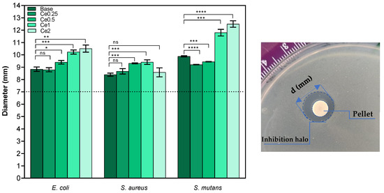 Measurements of inhibition halo diameter of all samples against Gram-negative (E. coli) and Gram-positive (S. aureus and S. mutans) bacteria, 24 h after incubation (ns: nonsignificant; * p ≤ 0.1; ** p ≤ 0.01; *** p ≤ 0.001; **** p ≤ 0.0001). Left side: Means of inhibition halo diameter for all microorganisms. Right side: example of a plate assay showing the inhibition halo of Ce2 pellet on S. mutans.