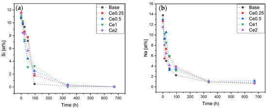 The reaction mechanism when the bioactive glass is immersed in SBF starts with an ionic exchange between the sample and the surrounding medium and a rapid release of soluble ionic species occurs. During the first 24 h, a layer of Si–OH is formed on the surface, leading to an increase in pH and consequently the formation of soluble Si(OH)4. The formation of the silica gel layer allows the absorption of ions from the environment, and there is also diffusion of Ca2+ and phosphate (PO43−) through this layer to the sample surface forming an amorphous calcium phosphate film which will subsequently crystallize [6,9,34,35]. Figure 4a,b shows a decrease in the amount of Si and Na at the sample surface over time due to the formation of the amorphous Ca and P layer and the dissolution of Si and Na into the surrounding medium. This result is verified in other studies that evaluate the amount of Si released into the medium as that it tends, contrarily to what is measured on the surface of the pellets, to increase during the first 4 days, stabilizing in the following days [29]. The formation of the calcium and phosphorus-rich layer is verified with the increase in the at% of both elements at the sample surface over the immersion time as shown in graphs 4(c) and 4(d). The Ca/P ratio suggests the formation of the apatite layer, as its value approaches the Ca/P ratio of hydroxyapatite (Ca/P ≈ 1.67) [36]. The sample that most rapidly approaches this value is the Ce2 sample (Ca/P = 1.66) at 96 h, indicating that the insertion of CeO2 does not influence negatively the bioactivity of the Bioglass® [29].