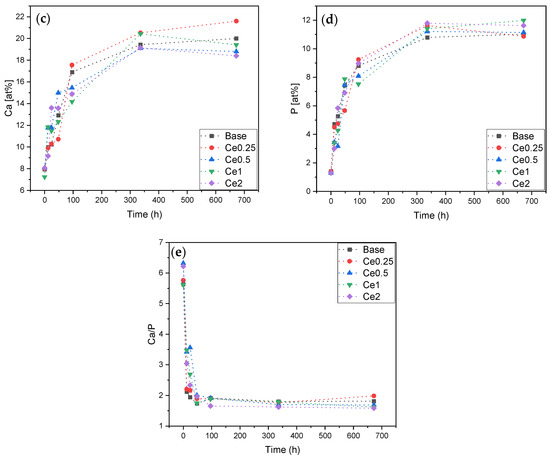 EDS of pellets surface after SBF immersion (12 h, 24 h, 48 h, 96 h, 336 h, and 672 h). (a) Si at%; (b) Na at%; (c) Ca at%; (d) P at%; and (e) Ca/P ratio.