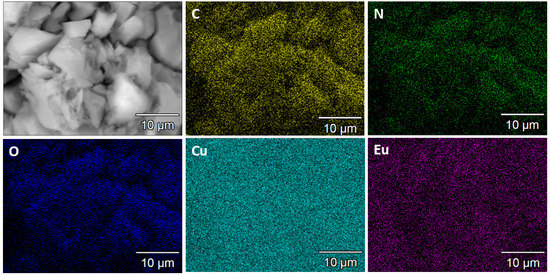 The novel Eu@Cu-MOF material was obtained by exchanging an NH4+ cation for Eu3+ in a previously described unique anionic NH4[Cu3(μ3-OH)(μ3-4-carboxypyrazolato)3] [43], which is a 3D porous framework built up of trinuclear Cu3(μ3-OH) clusters connected to six others through μ3-4-carboxypyrazolato bridges [43]. The tetrahedral cages generated in this way host two extraframework NH4+ cations and the water of crystallization molecules. The new Eu[Cu3(μ3-OH)(μ3-4-carboxypyrazolato)3] system contained 3.33 wt.% of europium. The results of the ICP-OES and elemental analyses were indicative of Eu3+ ions giving rise to the exchange of 10% NH4 cations, resulting in the formula (Eu)0.1(NH4)0.9[Cu3(μ3-OH)(μ3-4-carboxypyrazolato)3]∙7H2O, for simplicity indicated as Eu@Cu-MOF. Based on the EDS maps of the analyzed area, a high dispersion of europium was found, which indicated that the ion-exchange process allowed the formation of a homogeneous material (Figure 2).