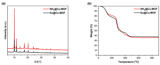 The properties of the derived material were investigated by different analytical techniques. In order to determine how the ion exchange process affected the structure and textural or thermal properties of Cu-MOF, a characterization was conducted for both NH4@Cu-MOF and Eu@Cu-MOF materials. The XRD patterns (Figure 3a) showed no significant difference between Eu@Cu-MOF and NH4@Cu-MOF, thus the structure remained stable even after the cation exchange. However, a slight decrease in the crystallinity could be observed after the process. The thermal stability of anionic MOF was evaluated by a thermogravimetric analysis. A high weight loss (in a similar range of 62–64%) could be noted for both systems (Figure 3b). According to the literature data, the weight loss in the first stage from 20 to 152 °C is indicative of sequential dehydration (−7H2O, calc./exp.: 18/18%). Further weight loss up to 450 °C is caused by the collapse of the skeleton [38].