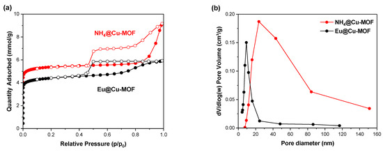 N2 adsorption–desorption (77 K) isotherms (a) and pore size distribution (b) of NH4@Cu-MOF and Eu@Cu-MOF.