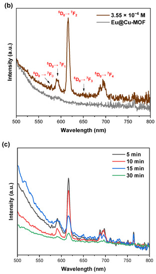 Emission spectra of Eu@Cu-MOF: (a,b) for different concentrations of AA (after treatment for 15 min); (c) for different times of treatment with AA (C = 7.10 × 10−4 M, λexc = 330 nm).