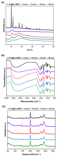 To test the stability of Eu@Cu-MOF, 15 mg of the material was mixed with 15 mL of deionized water for 30 min, 1 h, 4 h, and 24 h. Then, the material was collected by centrifugation, dried for 24 h at 50 °C, and analyzed using X-ray powder diffraction. In addition, IR and Raman spectra were recorded for the powders after the studied time.