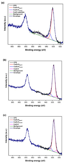 The high-resolution XPS spectra for Cu 2p of Eu@Cu-MOF before (a) and after 5 min (b) and 30 min (c) of treatment with AA at a concentration equal to 1.00 × 10−2 M.