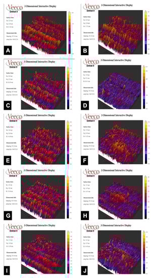 Profilometry analysis results are shown in Figure 2A–J. The surface roughness values Ra, Rq and Rt are presented in Table 2.