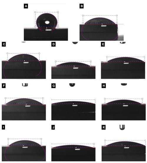 Representative images of contact angle measurement for various treated implant surfaces: (A) Negative-dry control group, (B) Positive-wet control group, (C) Laser, (D) Laser + H2O2, (E) Laser + CHX, (F) Ti brush, (G) Ti brush + H2O2, (H) Ti brush + CHX, (I) Ti curette, (J) Ti curette + H2O2 and (K) Ti curette + CHX.