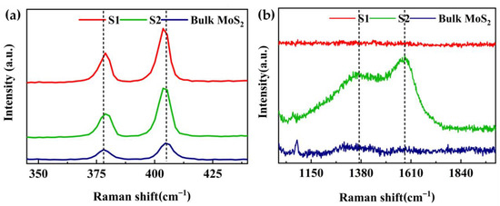 Raman spectroscopy is effective in distinguishing bulk from exfoliated 2D materials. Figure 2 shows the Raman spectra of bulk MoS2: S1 and S2. The two Raman peaks correspond to the high-energy mode and lower-energy mode. As shown in Figure 2a, all the samples displayed the and peaks of MoS2. Comparing with peaks of bulk MoS2, a red shift of peak and a blue shift of the peak were observed for both S1 and S2, respectively. These shifts are associated with nanosheets obtained with NMP and ACN [40,41]. Figure 2b presents two very broad and intense Raman peaks (1360 and 1580- cm−1) of S2, which may be assigned to NMP [31,36] that was not completely removed from the surface of MoS2 nanosheets although it was heated and reduced at 60 °C for several hours. In contrast, S1 showed no broad peaks, indicating that ACN was almost removed.