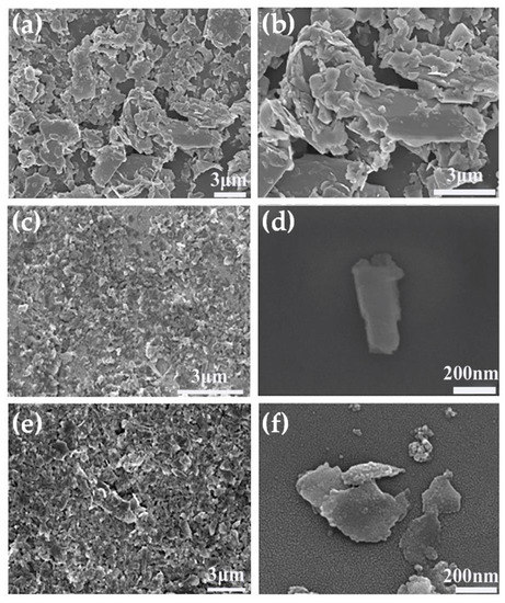 We next investigated the effect of grinding solvents on the morphology of MoS2 nanosheets. The SEM image shown in Figure 3a,b reveals the morphology of the starting MoS2 powder as a thick layer with dimensions ranging from about 1 to 6.4 μm. The SEM images presented in Figure 3c,d clearly indicate that the lateral sizes and thicknesses of layered MoS2 were reduced by combined grinding and sonication. The MoS2 nanosheets were obtained by grinding with ACN (S1), as shown in Figure 3c,d, and the nanosheets were uniform in size and well-dispersed, with the majority measuring between 0.1 and 0.5 μm. As shown in Figure 3e,f, exfoliation with NMP (S2) also produced nanosheets with good dispersion with lateral dimensions of 0.4–1.6 μm. The MoS2 nanosheets obtained by grinding with ACN were smaller than NMP-ground MoS2 nanosheets, which is consistent with the results reported in the literature [34] and the results of XRD patterns (Figure 1 and Figure S2).