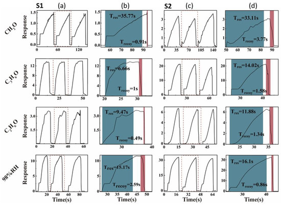 Sensing curves in the presence of different target gases of S1 and S2. (a,c) Gas-sensitive properties of S1 and S2 at 98% RH and 1000 ppm of CH2O, C3H6O, and C2H6O, respectively. (b,d) Response time of S1 and S2 at 98% RH and 1000 ppm of CH2O, C3H6O, and C2H6O, respectively.