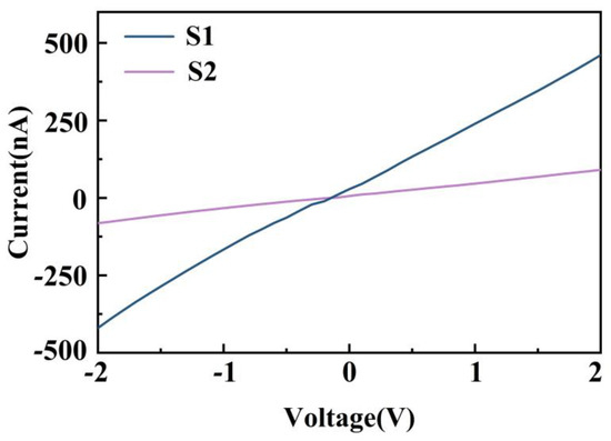 Figure 7 shows the I–V curves of S1 and S2 measured with an applied bias voltage ranging from −2 to 2 V at 1000 ppm CH2O. The I–V curves demonstrated a good ohmic contact between the sensing layers and the electrodes for both samples, which indicates that the sensor response was attributed to the sensitive material and not the metal–semiconductor contact.