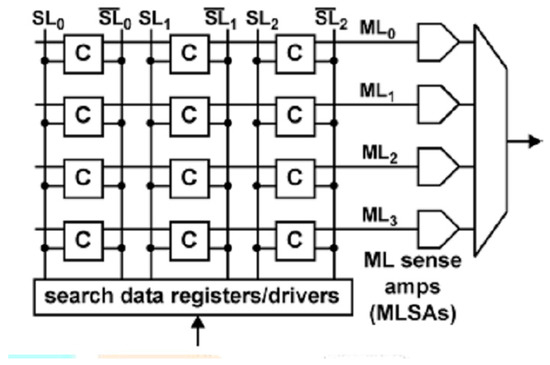 - Xiu, N.; Chen, Y.; Yin, G.; Ma, X.; Yang, H.; George, S.; Li, X. Capacitive Content-Addressable Memory: A Highly Reliable and Scalable Approach to Energy-Efficient Parallel Pattern Matching Applications. In Proceedings of the GLSVLSI’ 21: 2021 on Great Lakes Symposium on VLSI, Orange County, CA, USA, 6–8 June 2021; pp. 479–484. [Google Scholar] [CrossRef]