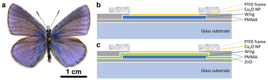 The dorsal wing surfaces of male P. icarus butterflies (Figure 1a) were used as biological photonic nanoarchitectures colored by structural color. Two different groups of sample structures were used: type-1 samples without (Figure 1b), and type-2 samples with (Figure 1c) 15 nm of conformally deposited ZnO layer [38].