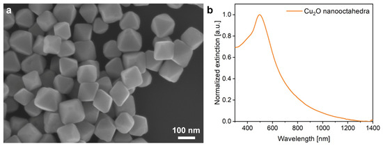 The Cu2O nanoparticles were of octahedral shape and uniform size (Figure 2), with the base edge length in the range of 136 (±12) nm and the maximum of their extinction is at 505 nm, which corresponds to their collective scattering and the band-edge absorption. Due to the smooth facets of the nano-octahedra, the extinction spectrum consists of a single narrow peak.