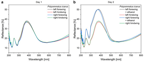 The effect of ethanol pretreatment and the reproducibility of the spectral measurements exemplified by the four wings of the same butterfly. (a) The reflectances of the four glass mounted wings measured before the ethanol pretreatment are shown, while in (b), the spectra of the same four wings, remeasured next day, are shown after two of the wings have undergone the ethanol pretreatment.