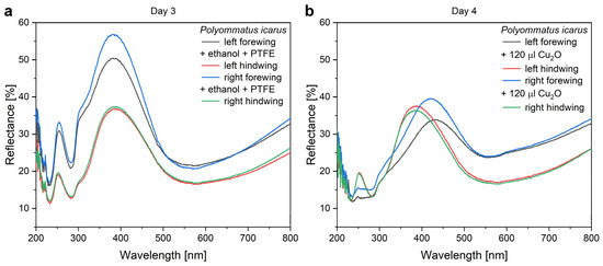 Change in the reflectance of two P. icarus males’ wings conformally covered by 15 nm ZnO after the application of 120 µL of Cu2O sol. (a) Reflectance of the 15 nm ZnO coated wings and (b) reflectance of the same wings after the application of 120 µL Cu2O sol.
