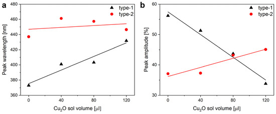 Modifications of the optical properties of the type-1 and of the type-2 samples after the application of the increasing amounts of the Cu2O sol onto the wing. (a) Peak wavelength and (b) peak intensity values are shown with their linear fits to guide the eye.