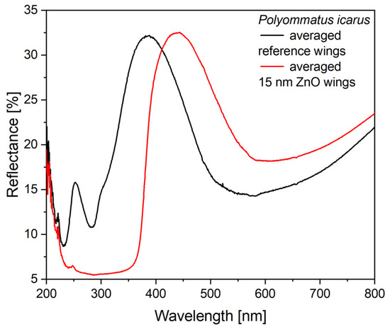 In the case of the type-2 samples, the Cu2O sol was applied on wings conformally covered by 15 nm ZnO layer deposited by ALD. The ZnO deposition modified the optical properties of the wing as shown in Figure 6. The most relevant modifications are: (i) the spectral position of the reflectance maximum is redshifted by 50 nm to 438 nm; (ii) due to the absorption of the ZnO layer, the samples have a very low reflectance below 380 nm.