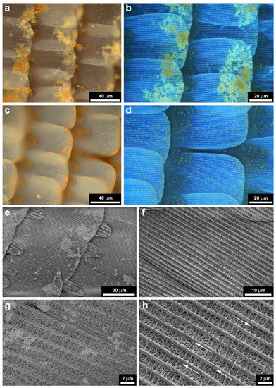 The careful investigation of type-1 and type-2 samples, which received 120 µL of Cu2O NP sol deposition, revealed clear differences in the spreading of the NPs on the wing scales. In Figure 8a,c, the type-1 and type-2 samples are shown under the optical microscope with crossed polarizers to enhance the visibility of the NPs. It can be clearly seen that on type-1 samples, a pronounced tendency for clustering of the NPs is observed towards the rounded end of the scales, while on type-2 samples, a more uniform distribution can be seen. These observations are supported by the images taken with a focus stacking microscope to compensate for the tilt of the scales with respect to wing membrane (the sample plane) (Figure 8b,d). The differences in the distribution of the NPs on the type-1 and type-2 samples are attributed to the different surface chemistry of the two kinds of samples. The SEM images of Figure 8 fully support the optical microscopy observations. In the detailed images in Figure 8g,h, one can see that while on the type-1 sample, the smaller grouping of the NPs also shows clustering, on the type-2 sample, individual NPs can be seen.