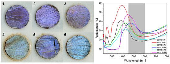 Type-2 samples were prepared according to the following sequence: all four wings were detached from the body of the butterfly. For one butterfly, two wings were kept in pristine state as comparison samples, the other two wings were used to prepare samples for further processing, these wings were fixed onto a Si wafer and loaded in the ALD apparatus. Next, a 15 nm conformal ZnO layer was deposited onto the wings. The homogeneity of the deposition was checked using a photo-processing procedure reported earlier [49] based on the transformation from the RGB color space to HSB through the parameters of hue, saturation, and brightness, which provides a more straightforward and objective way to analyze such photographs. The processed wing images are shown in Figure S1. After the ALD, the samples were glued with PMMA onto glass substrate and left to dry overnight; reflectance spectra with the integrating sphere were measured the next day. After measuring the spectra, the same procedure was used for the type-2 as for the type-1 samples, starting from the gluing of the 1 mm thick PTFE frames.