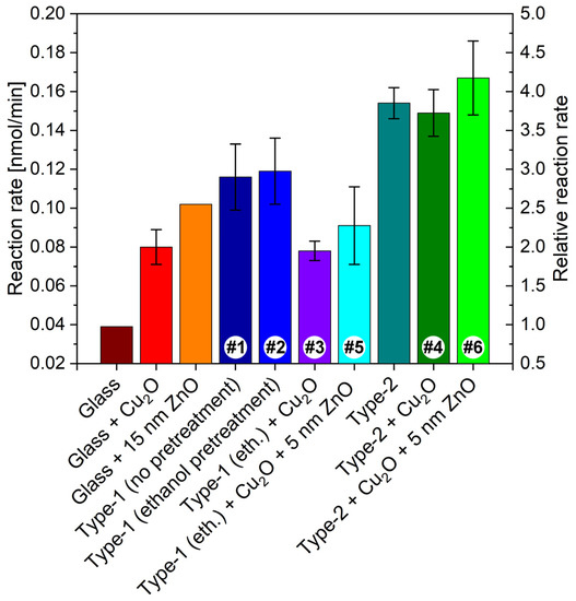 The relative reaction rates of Figure 10 may be helpful in comparing the individual effects of the various components of the more complex biotemplated photonic nanoarchitectures that proved to have the best efficiency in the photodegradation of the dye. The reaction rate on bare glass is taken as unity. The ethanol pretreatment itself does not affect the photocatalytic behavior of the butterfly wing. The following sequence of the primary components: bare glass, Cu2O NPs, 15 nm ZnO layer on glass, and butterfly wing can be established: Cu2O NPs double the reaction rate compared to bare glass; the ZnO layer on glass increases the reaction rate to 2.5 times with respect to the glass, but the butterfly wings (both untreated and ethanol pretreated) exhibited a reaction rate approximately three times larger compared with glass. When comparing the biotemplated systems: (type-1 sample + Cu2O NPs) and the type-2 sample, the latter has a reaction rate twice that of the former. The (type-1 sample + Cu2O NPs) has a lower reaction rate than the butterfly wings. This decrease is attributed, on one hand, to the reduced reflectance by the spectral modifications induced by the Cu2O NPs (Figure 9, sample #3) and to the moderate catalytic compatibility between Cu2O and rhodamine B. The application of Cu2O on the type-2 sample does not produce an improvement in the reaction rate, likely because of the weak electric contact between the Cu2O and the ZnO. After this is corrected by the deposition of 5 nm ZnO layer, the best performing sample is obtained, with a reaction rate almost 4.3 times that of bare glass.