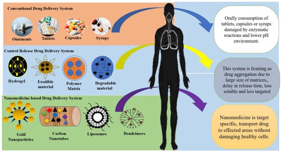 Due to all such reasons, the controlled-release drug delivery system was developed. Such evolution in the DDS enhances drug effectiveness in many ways [6]. DDSs have been engineered in recent years to control drug release [7]. Such engineered DDSs used various novel strategies for controlled drug release into the diseased areas. These strategies were erodible material, degradable material, matrix, hydrogel, osmotic pump, and reservoir [8]. They all provided a medium for the medicines to deliver at the desired sites like tissues, cells, or organs. In these approaches, drugs are often available for many diseases [9]. Such strategies were unsuccessful due to lower distribution, less solubility, higher drug aggregation, less target selection, and poor effects for disease treatment [10]. Moreover, drug development is the most expensive, intricate, and time-consuming process [5]. The innovative drug findings involved the identification of new chemical entities (NCEs), [11] having the vital distinguishing characteristics of drug capacity and pharmaceutical chemistry. This methodology, however, was confirmed to be less effective in terms of the overall attainment percentage [12], as 40% of drug development was botched due to its changeable responses and unpredicted noxiousness in humans [13]. From past decades until now, drug development and its delivery are shifting from the micro to the nano level to prolong life expectancy by revolutionizing drug delivery systems (Figure 1) [14].