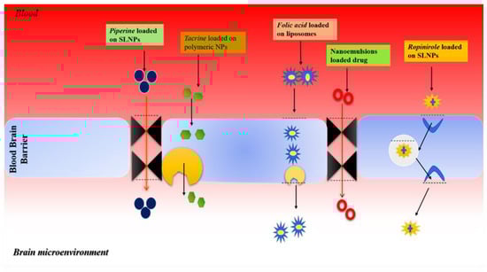 Diagram showing the mechanism of targeted drug delivery across BBB in brain microenvironment. Piperine loaded on SLNPs is injected intraperitonially, across BBB efferently to stop plaque formation. Polymeric nanoparticles are used for Tacrine delivery inside the brain, folic acid are loaded on the liposomes crossing blood–brain barrier to treat Alzheimer’s disease, while nanoemulsions and SLNP are loaded with drugs used to deliver medicines inside the targeted brain area to cure Parkinson’s disease.