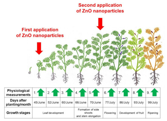 Schematic model of lentil growth stages. The red arrow shows the foliar application of 1 mg·L−1 ZnO-NPs, and the green arrows indicate the physiological measured time-intervals to assess lentil development.