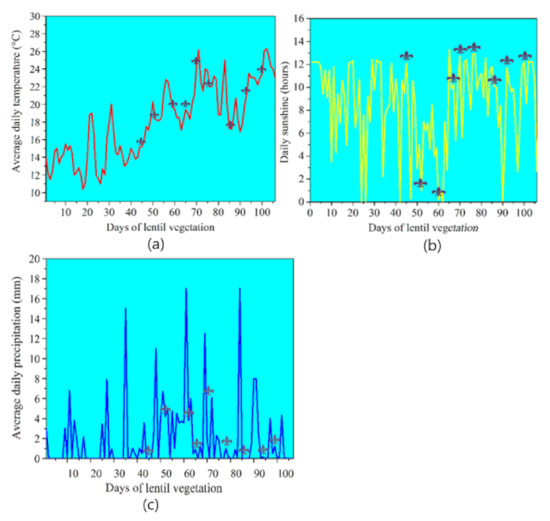Average (a) daily air temperature, (b) daily sunshine, and (c) daily precipitation during the entire 106-day lentil vegetation season at the Hostie experimental locality at Zlaté Moravce in Slovakia. This period covered sowing on 20 April 2020 to harvesting on 3 August 2020. The inserted grey markers indicate the measurement day.