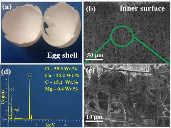 (a) Eggshell, (b,c) SEM image of cross section of eggshell under different magnifications, and (d) EDX spectrum of eggshell.