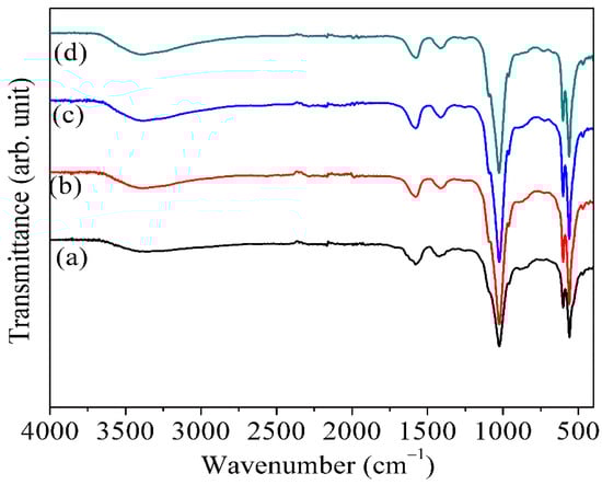 FTIR spectra of (a) pure HAp, (b) FHAp-1, (c) FHAp-2, and (d) FHAp-3.
