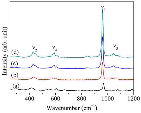 Raman spectra of (a) pure HAp, (b) FHAp-1, (c) FHAp-2, and (d) FHAp-3.