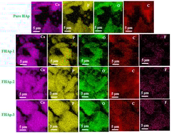 Figure 5 and Figure S1 represents the elemental mapping and elemental spectra of the F doped and pure HAp samples. The observed result reveals that the distribution of carbon (C), phosphorus (P), oxygen (O), and calcium (Ca) were found in the HAp of pure samples. However, the F doped samples, namely FHAp-1, FHAp-2, and FHAp-3, show the good distribution of fluorine (F), carbon (C), phosphorus (P), oxygen (O), and calcium (Ca), respectively. The content of fluorine is different in all the F doped samples. Hence, the distribution of fluorine can be easily viewed in Figure 5. The lowest distribution of fluorine is seen in the FHAp-1 samples and the highest order of distribution of fluorine is observed in the FHAp-3 samples. The quantitative elements in fluorine-doped and the undoped pure HAp are revealed in Table 3. The major elements like phosphorus (P), oxygen (O), carbon (C), and calcium (Ca) were found in the undoped HAp samples. However, the occurrence of carbon (C), phosphorus (P), oxygen (O), fluorine (F), and calcium (Ca) was observed for the fluorine-doped HAp samples. In addition, the Ca/P contents ratio present in the samples like undoped pure HAp, FHAp-1, FHAp-2, and FHAp-3 represents 1.86, 1.67, 1.73, and 1.70, respectively. The Ca/P content ratio clearly indicates that the produced undoped pure HAp and fluorine-doped HAp samples are non-stoichiometric natured HAp. The F quantitative (Table 3) amount present in the F-doped HAp samples indicates 0.6, 1.2, and 3.2 at.% for FHAp-1, FHAp-2, and FHAp-3.