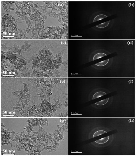 TEM image and corresponding SAED pattern (a,b) pure HAp, (c,d) FHAp-1, (e,f) FHAp-2, (g,h) FHAp-3.