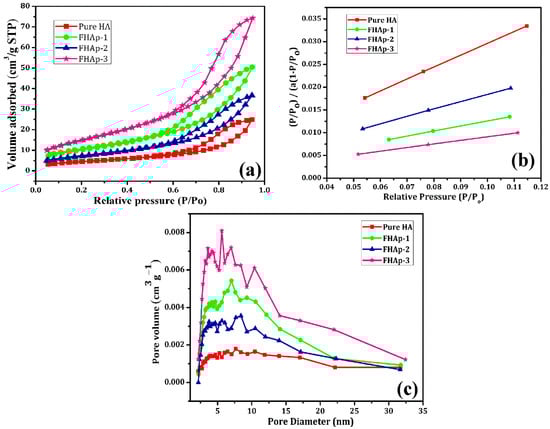 The porous features and surface area of the undoped HAp and F-doped HAp were characterized by the nitrogen isotherm and the acquired results are shown in Figure 7a. The differences between the undoped HAp and F doped HAp samples can be easily identified by the nitrogen isotherm. Figure 7a reveals that all the samples consist of well-defined H3 type hysteresis loop IV isotherms, which is a clear confirmation of the porous characteristics of the materials [58,59]. Therefore, it is confirmed that the undoped HAp and F doped HAp samples are porous. However, the differences in the porous nature are figured out from the nitrogen isotherm graph. The Brunauer–Emmett–Teller (BET) surface area plot was obtained based on the obtained nitrogen isotherm graph and it is represented in Figure 7b. The undoped pure HAp, FHAp-1, FHAp-2, and FHAp-3 nanorods surface areas were about 58.3, 98.7, 113.0, and 117.8 m2 g−1, respectively.