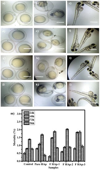 The in vivo toxicity of marked 25 numbers of zebrafish eggs dispersed in various ratios of (25–250 µg/mL) synthesized F doped HAp and pure HAp powders were assessed using the OECD-203 protocol and regulations. The embryos were added to 100 mL of Hank’s suspension along with different ratios of F-doped HAp and pure HAp powders. The embryos were incubated under controlled conditions and they were observed by using a 40× bright-field microscope at each 24 h period until 96 h for the generation of organs such as eyes, tail, heads, and liver [44]. For this assay, the water is regulated at a controlled temperature of 24 °C. The matured and dead embryos are measured separately according to the number of different solutions and all the samples are repeated in a triplicate manner.