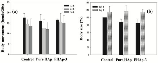 The wild-type N2 strain of C. elegans was also used to investigate the safety of HAp particles by assessing worms’ movement and body size. Synchronized worms at larval stage (L4) were picked and placed on the nematode growth medium (NGM) agar plates containing bacterial food, E. coli OP50 with 200 μg/mL of pure HAp, and FHAp-3, respectively. After 12, 24, and 36 h of incubation, the number of body bends of C. elegans for 20 s was scored under the stereomicroscope (SZ61, Olympus, Tokyo, Japan). All measurements were carried out three times per group with more than 20 worms. To measure the body size of C. elegans after feeding them each type of HAp, the worms grown with particles until 1 day or 2 days of adulthood were moved to fresh NGM agar plates without bacterial lawn and particles. The body sizes of the individual C. elegans were measured using ImageJ software (http://imagej.nih.gov, accessed on 10 December 2019) after taking pictures of worms under the microscope connected to the camera (C-5050, Olympus, Tokyo, Japan).