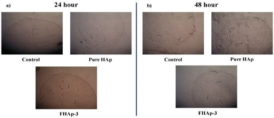 The antibacterial properties of synthesized undoped pure HAp, FHAp-1, FHAp-2, and FHAp-3 nanorods towards Gram-negative Pseudomonas aeruginosa (MTCC 2581) and Gram-positive Bacillus subtilis (MTCC 1133) bacteria are effectively assessed and the obtained outcomes are revealed in Table 4 and Figure 11. The disk diffusion assay was implemented to conclude the antibacterial properties of obtained undoped pure HAp, FHAp-1, FHAp-2, and FHAp-3 nanorods towards bacterial samples. Images of bacteriostatic and zone of inhibition are revealed in Table 4 and Figure 11. The undoped pure HAp nanorods do not have bactericidal effects on Pseudomonas aeruginosa (MTCC 2581) and Gram-positive Bacillus subtilis (MTCC 1133) bacteria. The antibacterial properties of FHAp-1 nanorods against Pseudomonas aeruginosa and Bacillus subtilis were clearly observed. The obtained zone of inhibition (diameter of the spherical area) was 11.3 ± 0.57 mm towards Pseudomonas aeruginosa and 11.00 ± 0.10 mm towards Bacillus subtilis. The F content in HAp showed good antibacterial activity against the tested bacteria. Similarly, FHAp-2 and FHAp-3 nanorods also showed an increased zone of inhibition, such as 11.65 ± 0.11 mm and 12.30 ± 0.05 mm towards Pseudomonas aeruginosa and 12.03 ± 0.01 mm and 16.33 ± 0.11 mm towards Bacillus subtilis. Hence, it is clear from the observation that with the increase in F-doping, the antibacterial properties of F-doped HAp are effectively enhanced towards the tested bacteria. Pseudomonas aeruginosa and Bacillus subtilis, a general toxic pathogen that forms biofilms and is antibiotic-resistant, may cause bone implement infections in hospitalized patients [68].