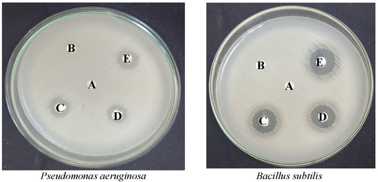 The Gram-positive Bacillus subtilis (MTCC 1133) and Gram-negative Pseudomonas aeruginosa (MTCC 2581) bacteria are used for the determination of the antibacterial properties of obtained F doped HAp and pure HAp. The single inoculum of P. aeruginosa and B. subtilis from the Luria Bertani (LB) agar plate are added to the liquid LB culture suspension for the development of seed culture at room temperature for 24 h. After the seed culture was formed, it was swabbed over Agar plates (Muller-Hinton). The inoculated plates were loaded with disks of HAp as disk A (negative control), disk B (undoped pure HAp), disk C (FHAp-1), disk D (FHAp-2), and disk E (FHAp-3). After the disk loading, the plates were incubated for 24 h at a temperature of 37 °C. All the experiments were performed in triplicates and the zone of inhibition was analyzed after the completion of the incubation period. The antibacterial activity was determined based on the zone formation (inhibition zone) around the disk.