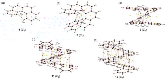 Figure 2 shows the molecular graphs, exemplified by 4, 7, 9, 11, and 12. Many BPs with BCPs are detected in the π···π interactions between the phenyl rings in close proximity to the helicenes. The molecular graphs for helicenes 3–12, except for 4, 7, 9, 11, and 12, are shown in Figure S3 of the Supporting Information.