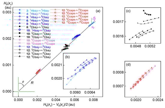 Plots of Hb(rc) versus Hb(rc) − Vb(rc)/2 for H-∗-H, C-∗-H, and C-∗-C, exemplified by those in 3–6, 8, 10, and 12. (a) Whole picture; (b) Magnified picture of the C-∗-H area; (c) Magnified picture of the C-∗-C bay area; (d) Magnified picture of the C-∗-C cape area. The definitions of (R, θ) and (θp, κp) are illustrated, exemplified by H-∗-H in 4.