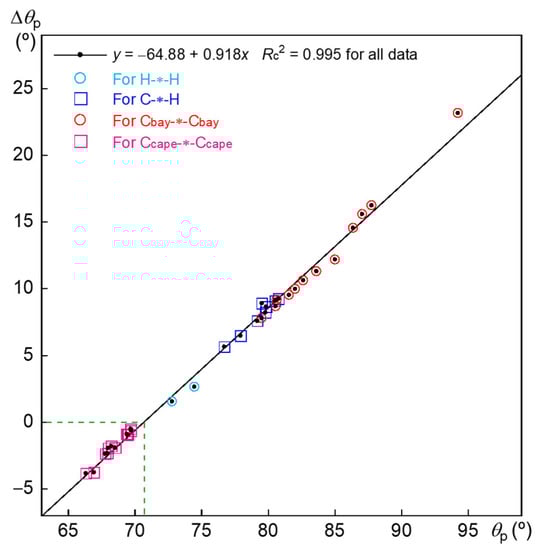 Interactions with θ > θp occur under some specific conditions. To examine the behaviour of θ and θp in 7–12, the Δθp (=θp – θ) values are plotted versus θp for C-∗-C, H-∗-H and C-∗-H in 3–12. Figure 4 shows this plot. The plot showed a very good correlation for all data (y = 0.918x – 64.88: Rc2 = 0.995). (A substantial correlation was not found in the plot of Δθp versus θ due to the very small range of θ). The two areas for C-∗-C interactions with Δθp > 0 and Δθp < 0 are clearly illustrated by the green dotted lines in Figure 4. The Δθp values for the interactions are positive if the θp values are larger than 70.7°, whereas Δθp < 0 if θp < 70.7°. Figure 4 clearly shows that Cbay-∗-Cbay and Ccape-∗-Ccape in 9–12 belong to the areas where Δθp > 0 and Δθp < 0, respectively.