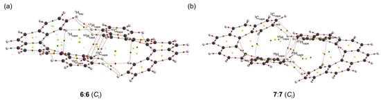 What is the behaviour of the interactions when the helicenes form concave-type dimers? The behaviour was elucidated, exemplified by 6:6 (Ci) and 7:7 (Ci) with M06-2X/6-311+G(3d,p). Figure 5 shows molecular graphs of 6:6 and 7:7. Five and four independent BPs with BCPs were detected in 6:6 and 7:7, respectively, between the components of H-∗-H and C-∗-H, as well as two independent BPs with BCPs for the intramolecular C-∗-H interactions in each component of 6:6 and 7:7. The behaviour of the interactions was also investigated for 7:7 (Ci), 8:8 (Ci), and/or 10:10 (Ci) with M06-2X/6-311+G(2d,p) and LC-ωPBE/6-311+G(2d,p). The results are collected in Tables S7 and S8 of the Supporting Information. The QTAIM functions were similarly calculated for the intermolecular interactions at the BCPs on the BPs of 6:6 and 7:7 with M06-2X/6-311+G(3d,p).