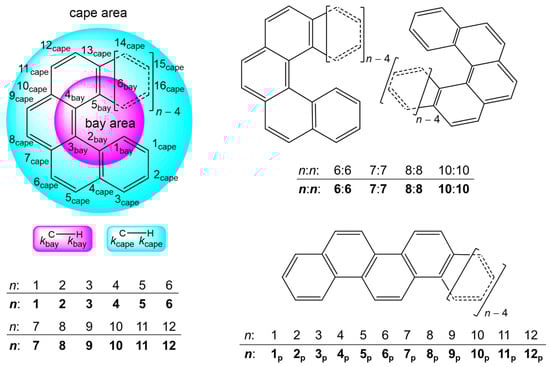Helicenes, 1–12, dimers, 6:6–8:8 and 10:10, and [n]phenacenes, 1p–12p. The bay and cape areas in 1–12 are illustrated. The number of C is shown, where the number of H is the same for C–H. Benzene, naphthalene, and phenanthrene are defined corresponding to n = 1, 2, and 3, respectively.