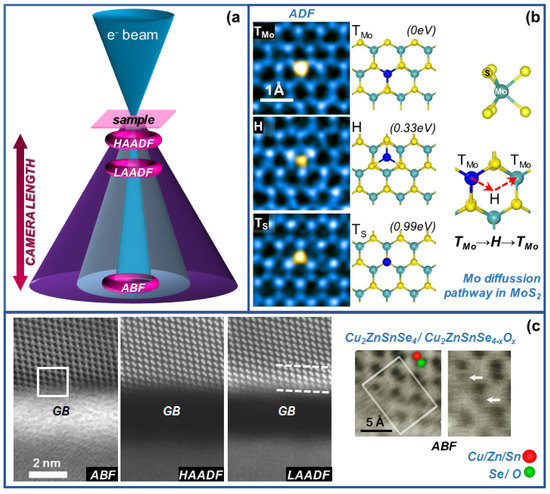 (a) Different techniques achievable at atomic resolution by means of annular detectors (HAADF, LAADF, ABF). (b) Atomic-resolution ADF images (left) and corresponding atomic models (middle) of different adsorption states of a Mo atom on top of Mo site (TMo), at hexagon center or hollow site (H) and on top of S site (TS), from top to bottom. DFT calculated energy for each state is indicated between brackets (right). Most likely pathway for Mo diffusion in MoS2, TMo → H → TMo. S and Mo are represented by yellow and cyan spheres, respectively. Adapted with permission from ref [6]. Copyright 2017, American Chemical Society. (https://pubs.acs.org/doi/abs/10.1021/acs.nanolett.6b05342, 9 December 2021). (c) Polycrystalline Cu2ZnSnSe4 thin films showing an amorphous intergranular oxide phase (grain boundary, GB). O substitutes some Se sites near the grain boundary, leading to the observed strain contrast (LAADF image) arising from compositional differences (O content). Adapted with permission from ref [7].
