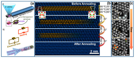The severe instrumental stability requirements to successfully perform (S)TEM measurements prevent the direct implementation of in situ analyses with conventional instruments, hindering the study of dynamic processes. Fortunately, these limitations can be overcome by specifically designed solutions, which allow for working under different experimental conditions such as varying temperatures, pressures, electric environments, liquid state studies, and so on. The implementation of in situ measurements involves either using environmental TEMs, where the sample chamber works at higher pressures than the microscope column by means of differential pumping, or using specific sample holders that provide the desired environmental conditions for the experiment of interest directly at the sample [85]. In situ holders provide a controlled environment at the sample vicinity, which is isolated from the microscope column by the holder geometry (i.e., the sample is placed between two electron-transparent stacked layers (see Figure 6a) while the microscope vacuum inside the whole column is kept. Based on such a configuration, in situ TEM holders allow for varying not only the temperature, current, or voltage for the sample, but also for supplying gas species to carry out in situ growth experiments. Similarly, liquid-phase measurements require suitable cells to encapsulate the liquid sample between two stacked thin chips with transparent windows at the electron pathway. These TEM cells are usually made of SiNx, but different alternatives have shown up during recent years, enabling the production of TEM cells based on 2D-like materials, such as graphene or h-BN for in situ measurements [86,87].