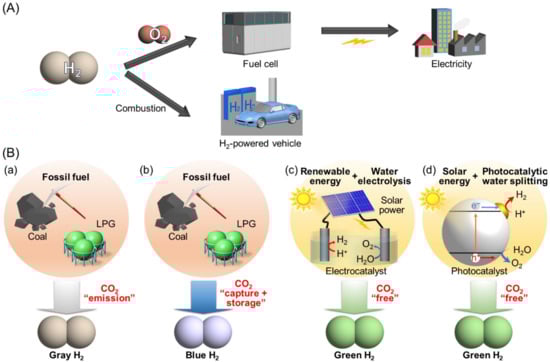 (A) Schematic of the expected use of H2 in a “H2-energy society”. (B) Coloration of H2 production methods: (a) gray H2, (b) blue H2, and (c) green H2 produced by renewable energy, and (d) green H2 produced by water-splitting photocatalyst. LPG represents liquefied petroleum gas.